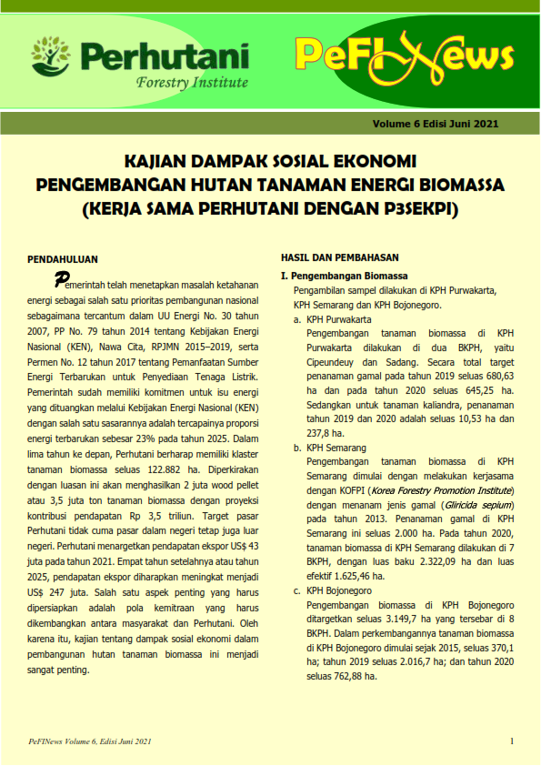 KAJIAN DAMPAK SOSIAL EKONOMI PENGEMBANGAN HUTAN TANAMAN ENERGI BIOMASSA (KERJA SAMA PERHUTANI DENGAN P3SEKPI)