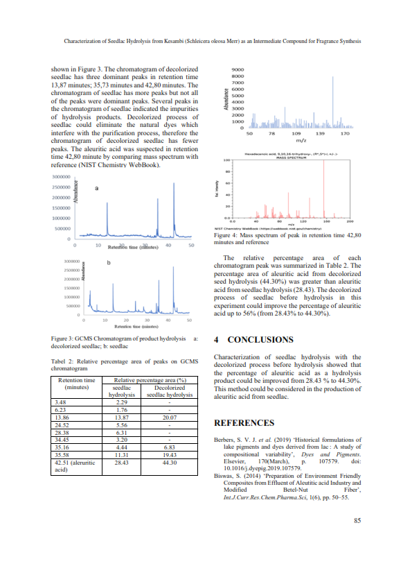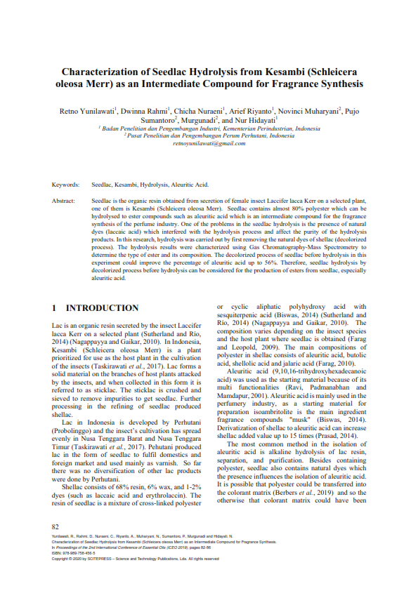 Terus Hijaukan Negeri >> Blog >> CHARACTERIZATION OF SEEDLAC HYDROLYSIS FROM KESAMBI (Schleicera oleosa Merr) AS AN INTERMEDIATE COMPOUND FOR FRAGRANCE SYNTHESIS