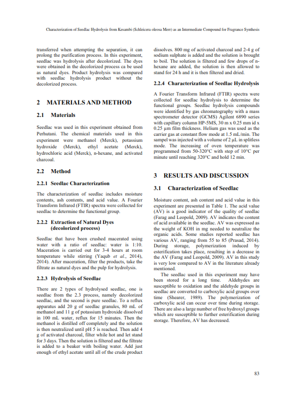 CHARACTERIZATION OF SEEDLAC HYDROLYSIS FROM KESAMBI (Schleicera oleosa Merr) AS AN INTERMEDIATE COMPOUND FOR FRAGRANCE SYNTHESIS