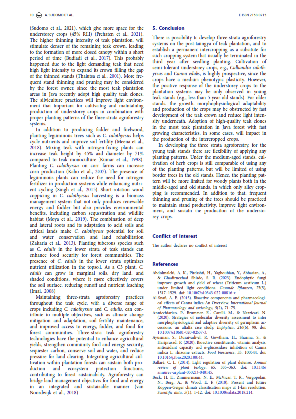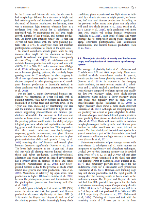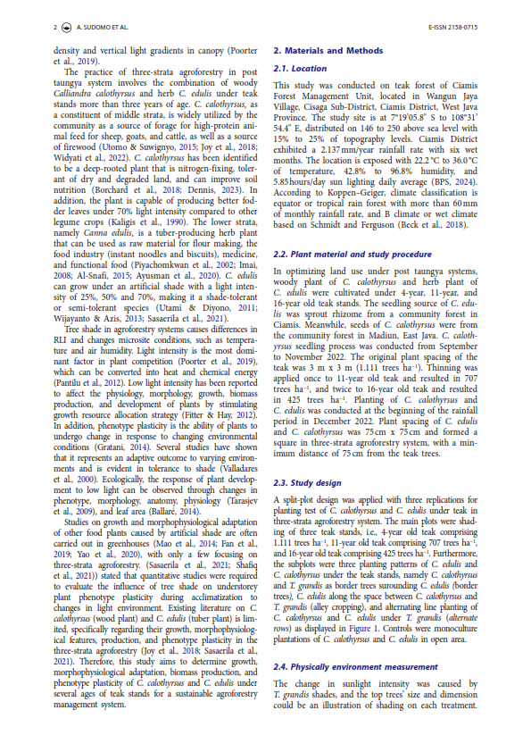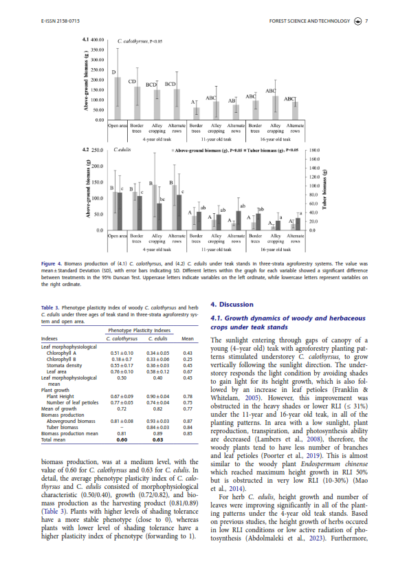 GROWTH, MORPHOPHYSIOLOGICAL ADAPTATION, BIOMASS PRODUCTION, AND PHENOTYPIC PLASTICITY OF CALLIANDRA CALOTHYRSUS AND CANNA EDULIS UNDER TEAK STANDS IN THREE-STRATA AGROFORESTRY SYSTEMS