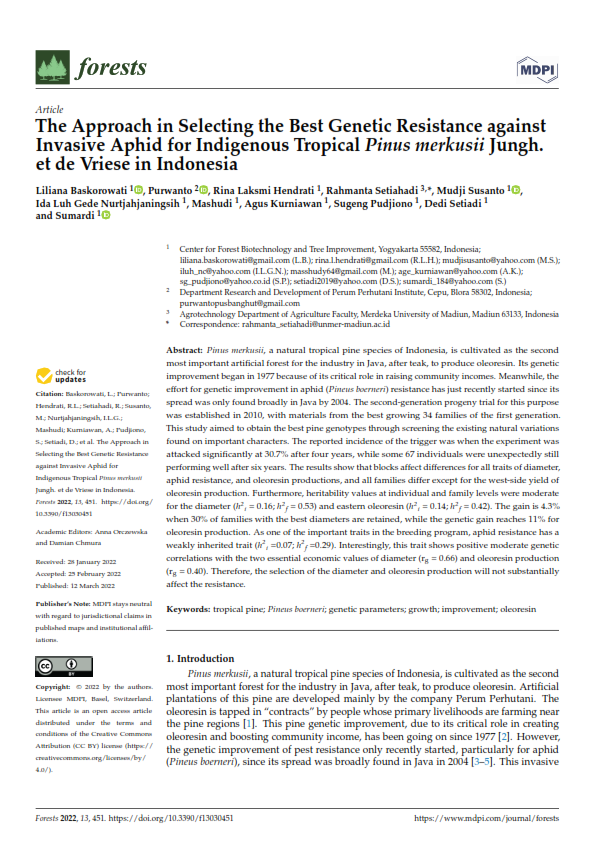 THE APPROACH IN SELECTING THE BEST GENETIC RESISTANCE AGAINST INVASIVE APHID FOR INDIGENOUS TROPICAL PINUS MERKUSII JUNGH. ET DE VRIESE IN INDONESIA
